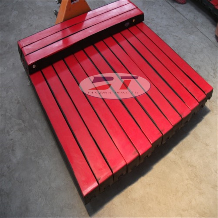 緩沖滑條是緩沖床的重要組成部分,常規(guī)的皮帶機(jī)落料點(diǎn)保護(hù)裝置為緩沖托輥,在生產(chǎn)過程中緩沖托輥的劣勢不斷暴露出來,緩沖托輥與皮帶機(jī)接觸是點(diǎn)與面的接觸,受力不均勻,不但不能保護(hù)皮帶機(jī)還會加重對皮帶機(jī)局部造成更嚴(yán)重的損傷。由于緩沖托輥之間間距較大 落料容易卡在托輥中間,托輥停止轉(zhuǎn)動。緩沖滑條又稱緩沖膠條,由高分子聚乙烯板硫化在天然橡膠條上成型。有些聚乙烯板與橡膠條的連接是采用冷粘粘結(jié),這種緩沖條在落料的重?fù)粝聲斐擅撃z,開裂。