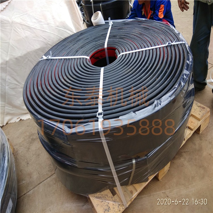 4、皮帶機防溢裙板密封效果:防溢裙板采用直板+裙邊雙層密封一體化結(jié)構(gòu),直板緊貼導料槽側(cè)幫,底部與皮帶接觸,防止物料外溢;裙邊外翻起,可在一定角度內(nèi)旋轉(zhuǎn),靠橡膠板彈力,自動跟蹤皮帶,始終與皮帶保持緊密接觸,密封性能優(yōu)異。裙邊主體采用一次性一體熱硫化方式制成,結(jié)構(gòu)緊湊有效,結(jié)實耐用。