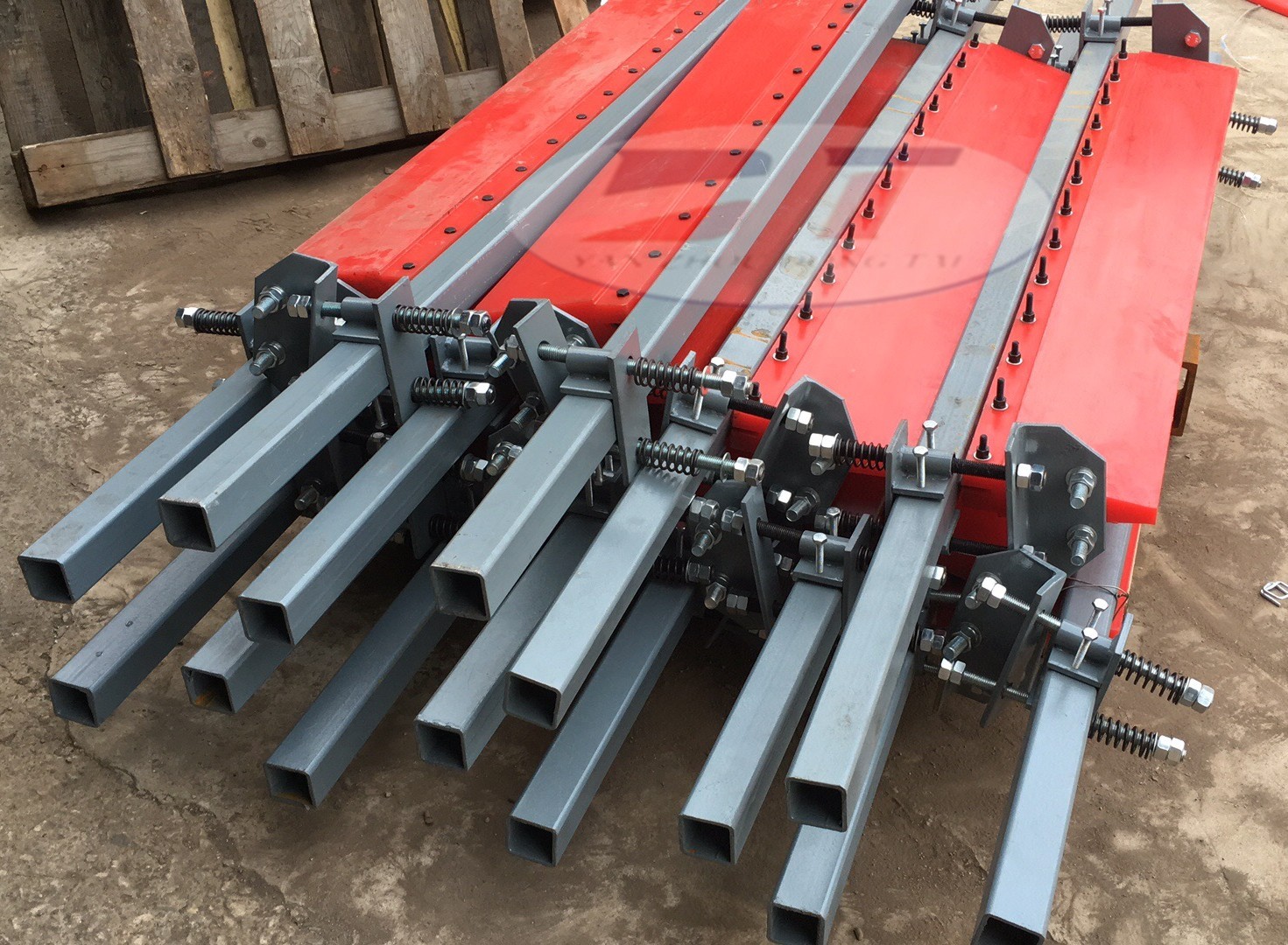 一級聚氨酯清掃器適應(yīng)范圍:用于卸載物料不干凈,物料粘附輸送帶;安裝在卸載滾筒表面,剛好在物料軌道的下方。二級聚氨酯清掃器用于帶式輸送機(jī)回程皮帶下表面附屬物的第二次清掃。安裝在卸料滾筒下方回程段位置,解決殘留物料在輸送機(jī)回程段灑落造成的環(huán)境污染和殘留物料粘黏在托輥上引起的回程皮帶跑偏的問題。