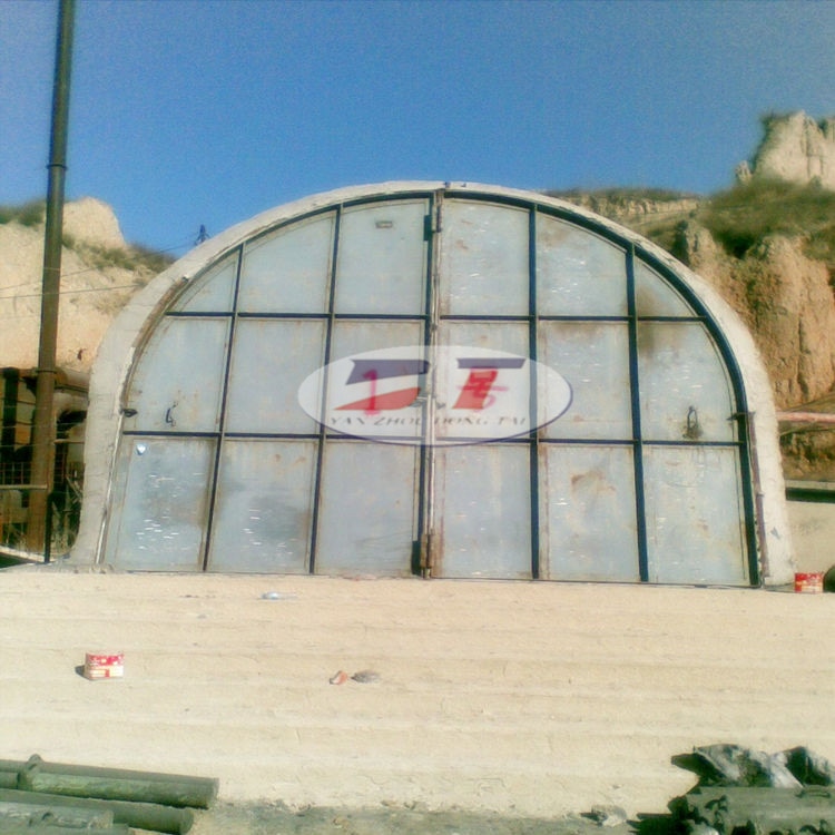 斜風(fēng)井防爆門是安裝在裝有主要通風(fēng)機(jī)的排風(fēng)井口上的特殊密封井蓋。在正常通風(fēng)時(shí),它被用來(lái)隔離井下氣流與地面大氣,防止風(fēng)流短路,保證通風(fēng)系統(tǒng)正常。當(dāng)井下一旦發(fā)生瓦斯或煤塵爆炸事故時(shí),防爆門被爆炸的氣流沖擊打開(kāi),從而爆炸氣流直接排放到地面大氣,起到卸壓作用,防止主要通風(fēng)機(jī)因爆炸氣流沖擊而造成損壞;當(dāng)主要通風(fēng)機(jī)停止運(yùn)行時(shí),可以打開(kāi)防爆門,以利用自然風(fēng)壓通風(fēng)。