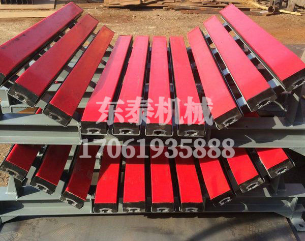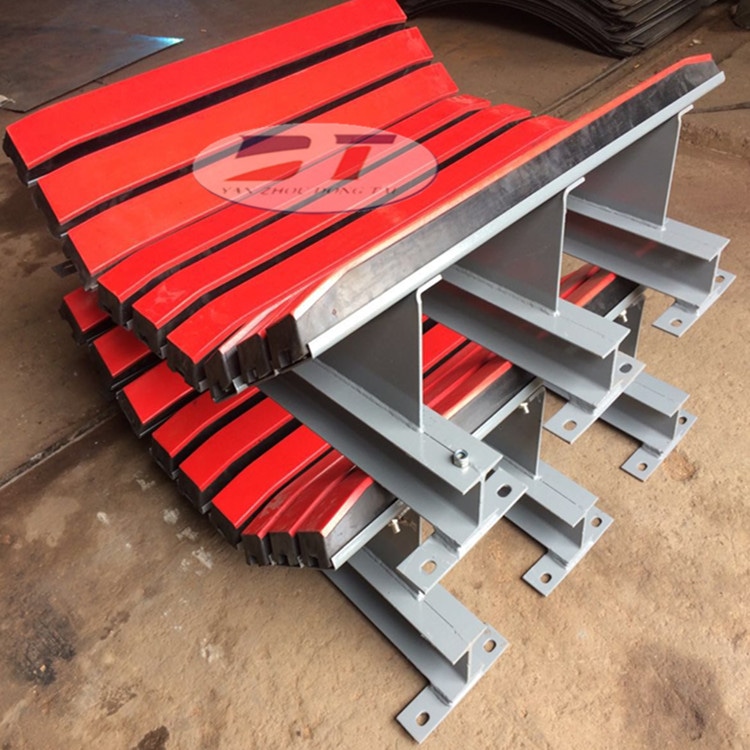 緩沖床主要用于替代緩沖托輥,緩沖床由緩沖條組成,而緩沖條主要應用優(yōu)良的高彈性特種橡膠層充分有效吸收了物料下落時的沖擊力,大大降低了物料下落時對輸送帶的沖擊,真正的改善了落料點的受力狀況。并采用特殊的UHMW高分子聚乙烯表面,使輸送帶與緩沖條之間的摩擦系數(shù)降到低,且耐磨性好。緩沖床的使用保證了輸送帶的面與面的接觸,受力均勻,有效防止了由于托輥斷裂、脫落造成的皮帶縱向撕裂,同時大大降低了皮帶被銳器或尖銳物料穿透后縱向撕裂的概率。