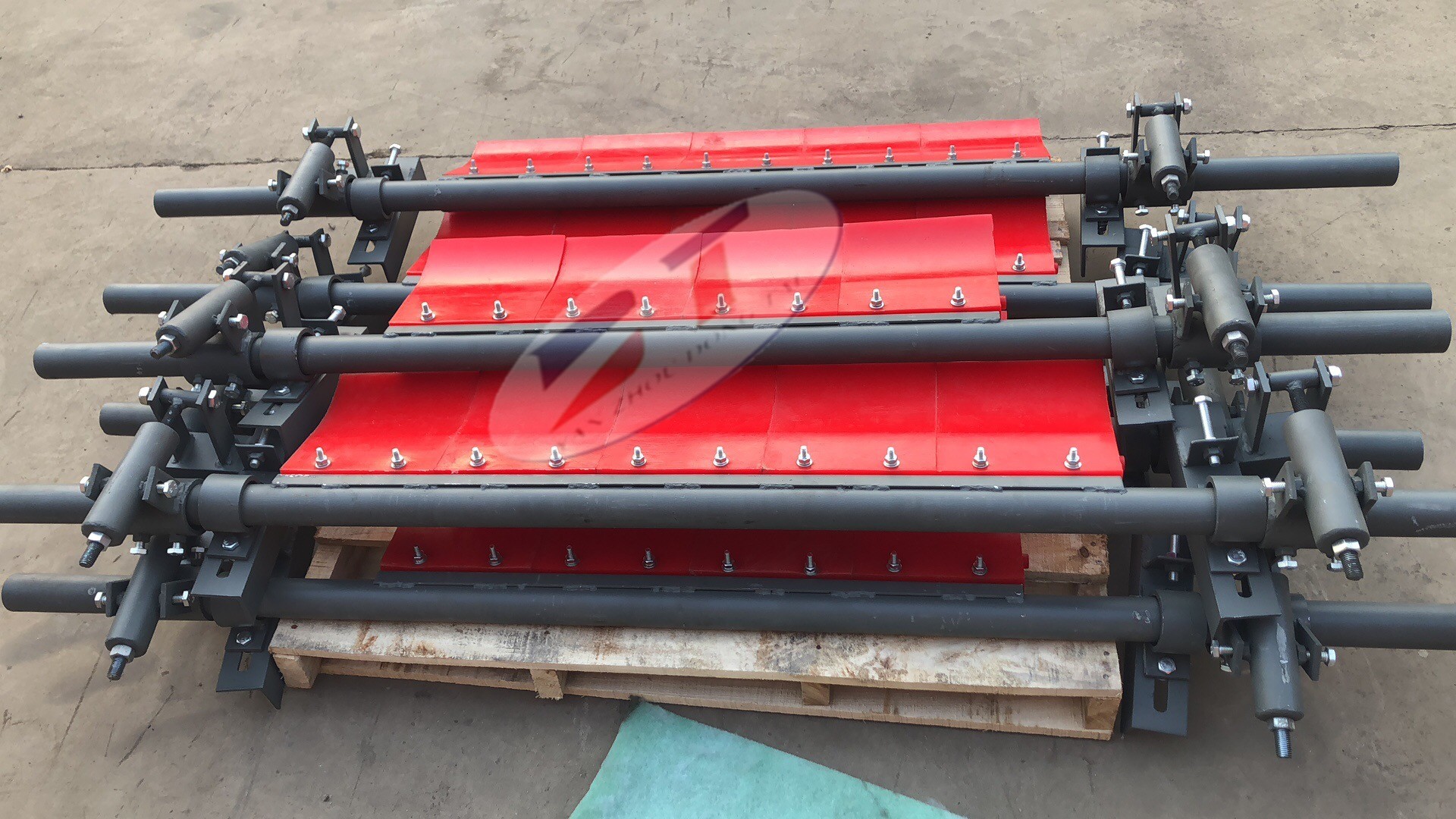 清掃器在輸送機上有著不可忽視的作用。在運行中,如果人為的清除機尾滾筒附著物,往往容易發(fā)生嚴重人身傷亡事故。而清掃器有及時、方便地、快速的清除滾筒附著物的特點。