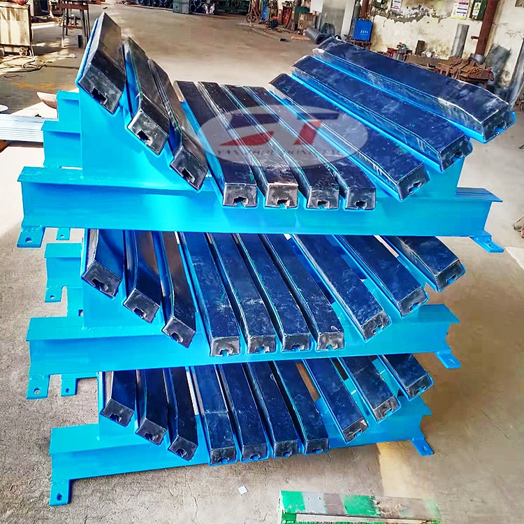 4、緩沖條的表面材料為UHMW-PE,表面光滑且耐磨,可減少摩擦阻力,延長使用壽命。橡膠可有效吸收物料對(duì)皮帶的沖擊力。