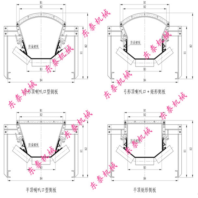 在輸送帶的下面,將原槽型托輥組更換為短槽型托輥組,用來支撐輸送帶的物料重力部位。輸送帶的兩邊非重力部位,用帶有減摩耐磨材料的底板來支撐,即支撐輸送膠帶,又可起密封作用,此支撐底板同側(cè)板連接在一起,側(cè)板同頂板連接在一起,共同組成殼式密封結(jié)構(gòu)。導(dǎo)料槽的底邊寬度為2/3-1/2帶寬導(dǎo)料槽的截面形狀分為:矩形和弧形兩種。導(dǎo)料槽設(shè)計分為后擋板、槽體、前簾三個部分設(shè)計。裝于帶式輸送機的受料處約束物料不往外撒落導(dǎo)料槽:可使從漏斗落下的物料在達(dá)到帶速之前集中到輸送帶的中部。導(dǎo)料槽的底邊寬度為2/3-1/2帶寬導(dǎo)料槽的截面形狀分為:矩形和喇叭形兩種。導(dǎo)料槽設(shè)計分為后擋板、槽體、前簾三個部分設(shè)計。