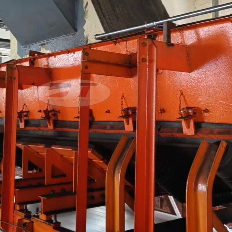 導料槽進行了擴容,導料槽容腔非常大,有助于降低誘導風。取消側托輥,皮帶側部支撐改為半托板半托輥結構,板托板采用超高分子聚乙烯制作,半托輥為聚氨酯包膠緩沖托輥。由于皮帶兩側部防溢裙板密封位置為聚乙烯板平托支撐,可有效防止因皮帶運行抖動造成的導料槽密封不嚴的問題:而皮帶側部下半載煤部分,由半托輥支撐,可有效降低皮帶的運行阻力。